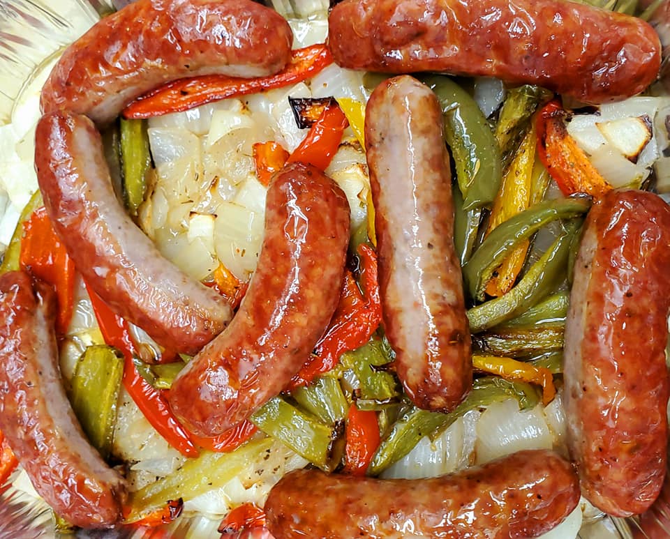 Sausage & Peppers: Sweet Italian Sausage, Onions & Bell Peppers, served w/ Angel Hair Aglio Olio.