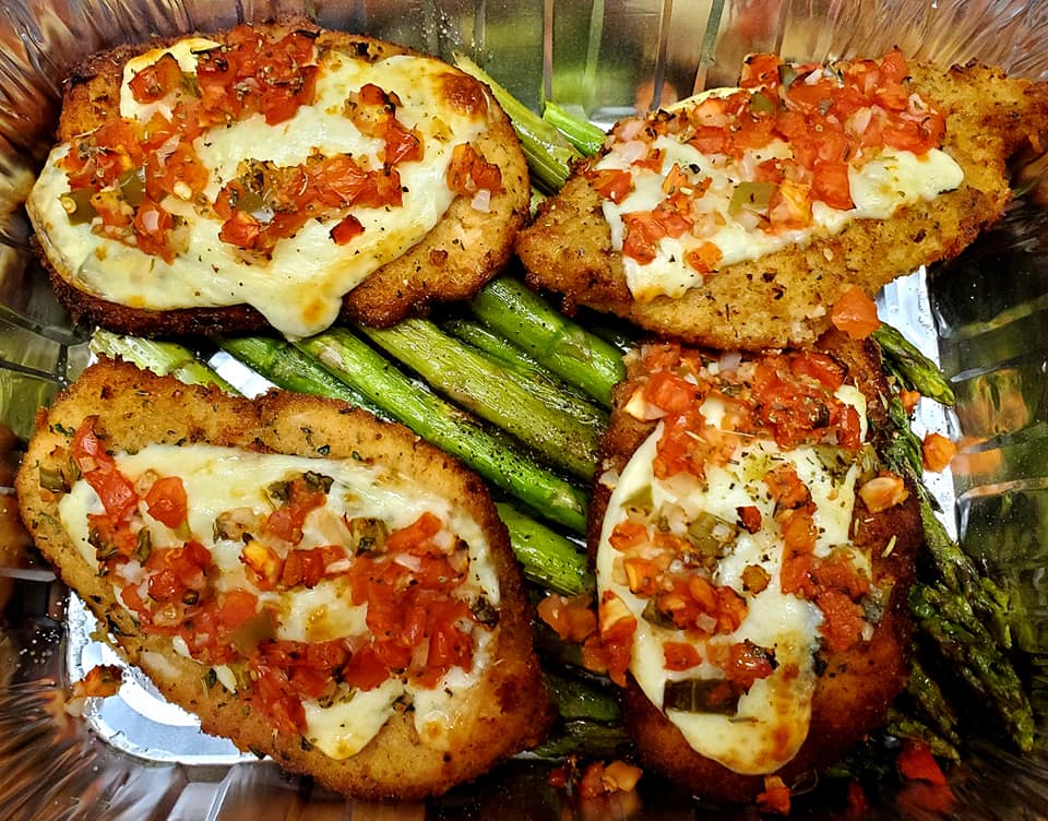 Bruschetta Chicken: Seasoned Grilled Chicken, topped w/ Tomato Bruschetta & Sharp Provolone, served w/ Oven Roasted Zucchini & Yellow Squash.