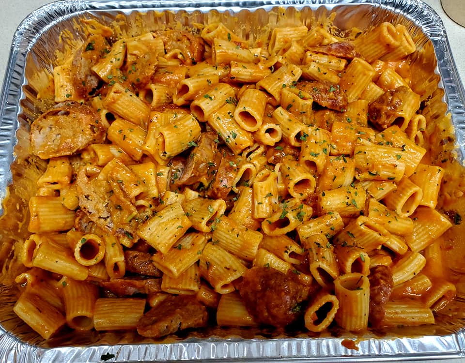 Vodka Rigatoni: Rigatoni Pasta in a Rich & Creamy Vodka Sauce, topped w/ Pecorino & Romano Cheeses, served w/ Oven-Roasted Zucchini & Garlic Bread.