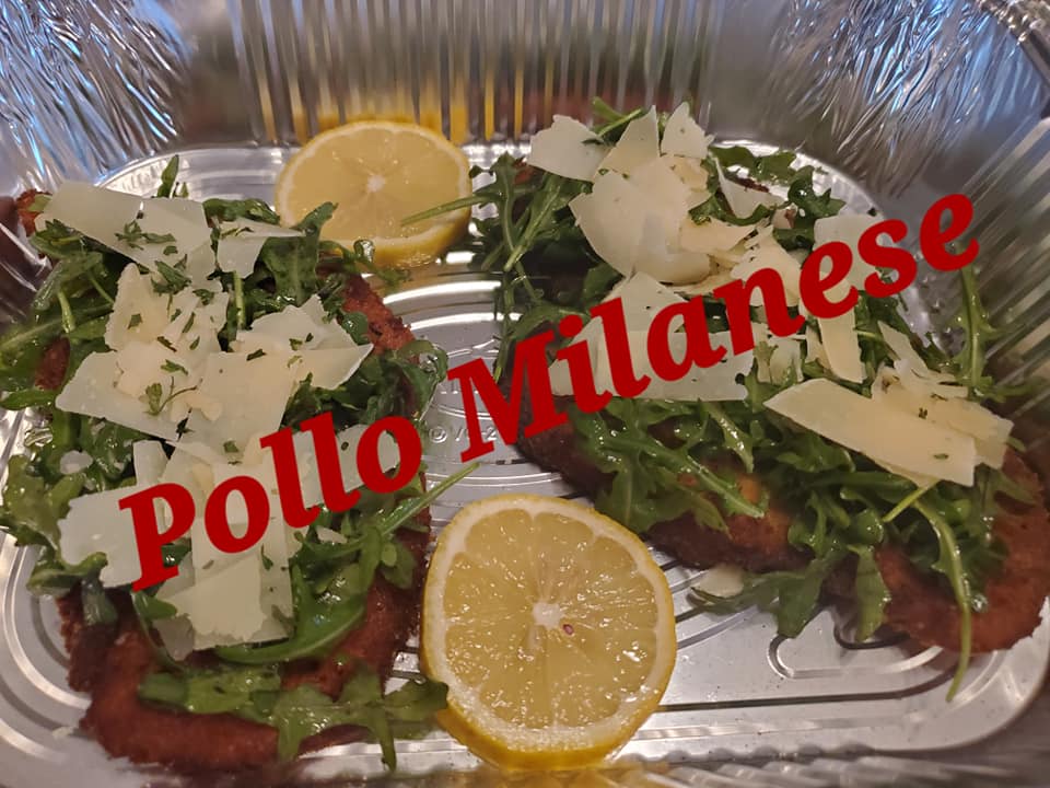 Pollo Milanese: Pan-fried Breaded Chicken Cutlet topped w/ Arugula, Shaved Parmesan & Lemon Vinaigrette, & served w/ Oven-Roasted Zucchini & Homemade Garlic Bread