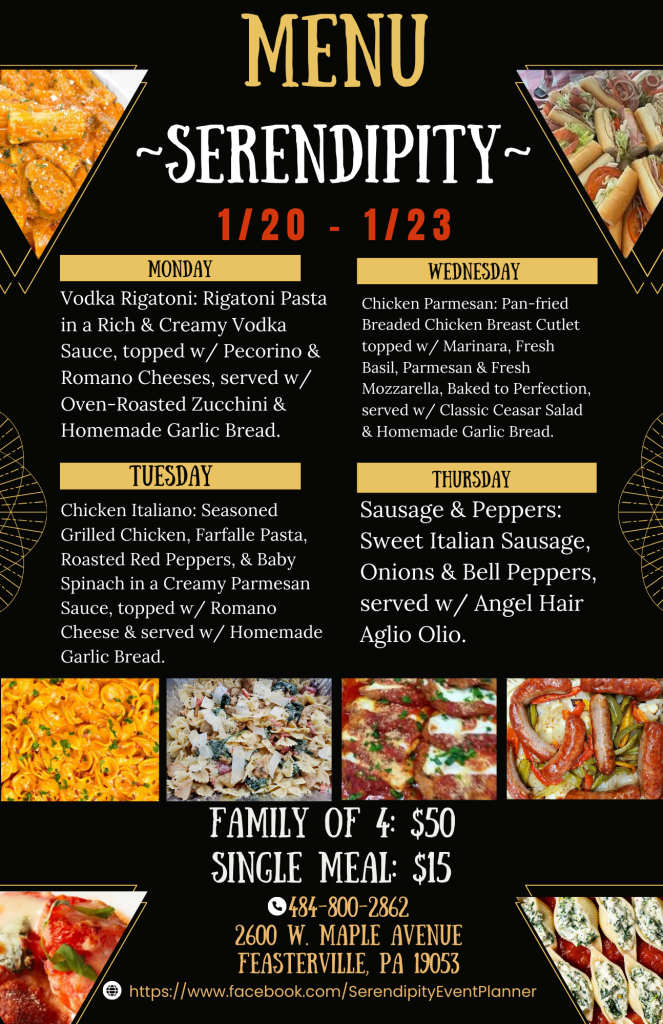 This week’s menu is complete! Let Serendipity cook for you and your family! Homemade Authentic Italian meals! All ingredients are purchased fresh daily! Pick-up and delivery options available! Pre-order now and pre-pay through Venmo @GinaMerante … Kitchen is located at 2600 W. Maple Avenue, Feasterville, PA 19053. Message or call now for a spot!